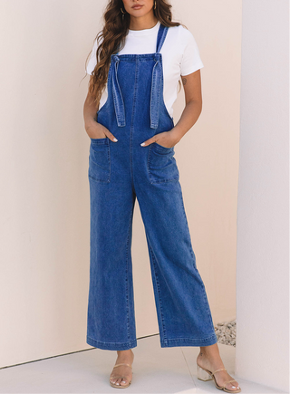 Prussian Blue Mineral Wash Knotted Strap Patched Pocket Wide Leg Denim Overall