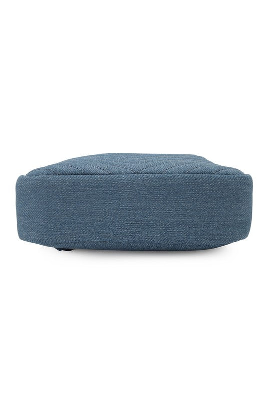 Sling your essentials in style with this chevron-quilted denim bag that's equal parts practical and chic. Crafted from sturdy denim canvas paired with faux vegan leather accents, it features a secure zip-top closure and vintage-inspired antique gold-tone hardware that adds a touch of retro charm. The adjustable shoulder strap lets you wear it however feels right. Compact yet spacious at 7.5"L × 12.5"H × 3"W, it's your new go-to for everyday adventures.