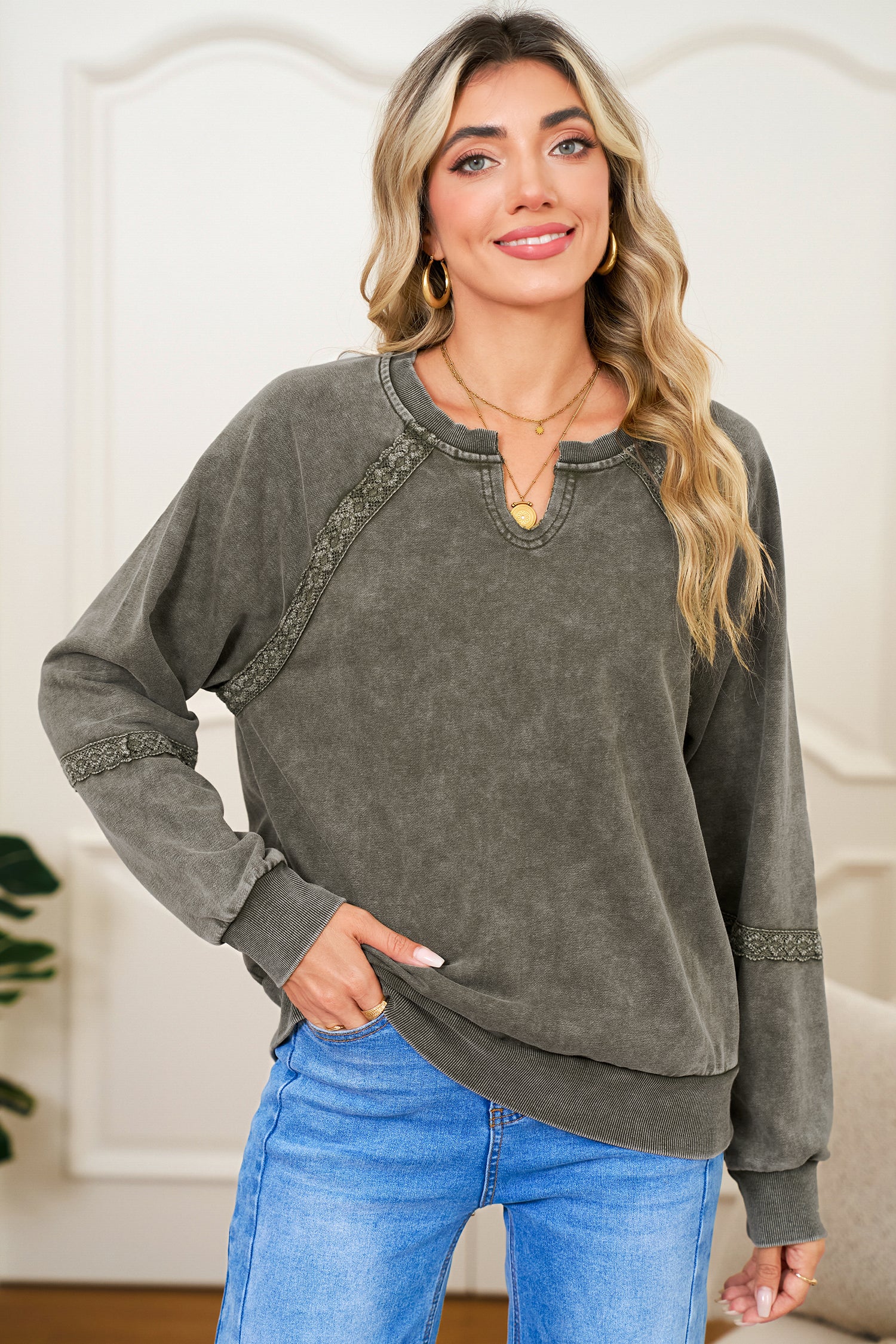 Jungle Green Lace Applique Notched Neck Mineral Wash Baggy Sweatshirt