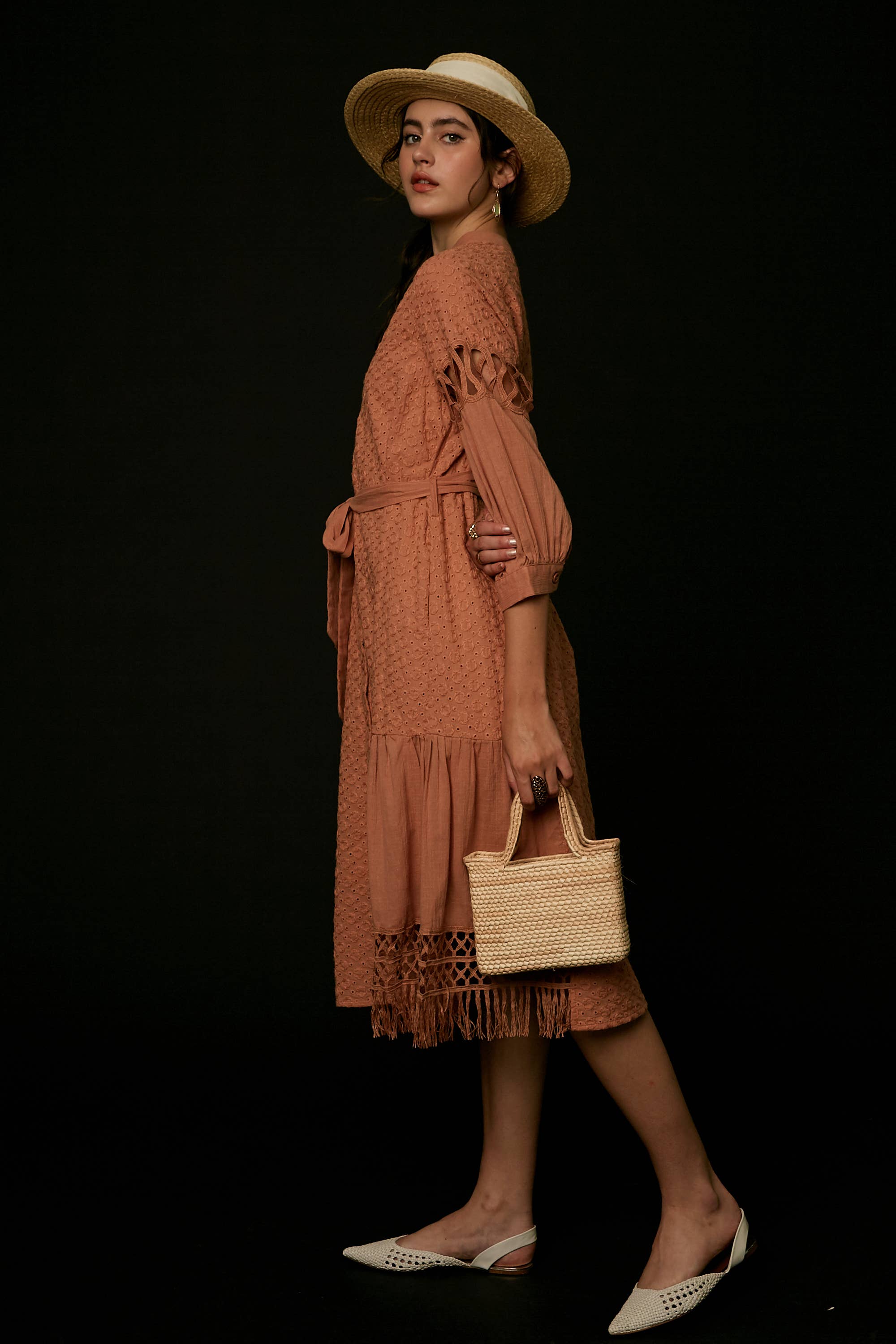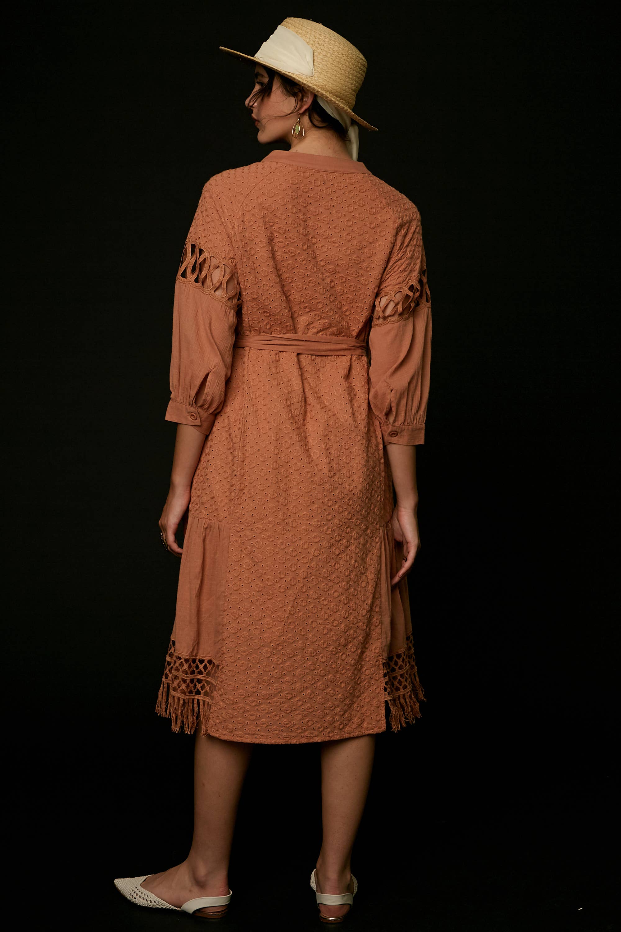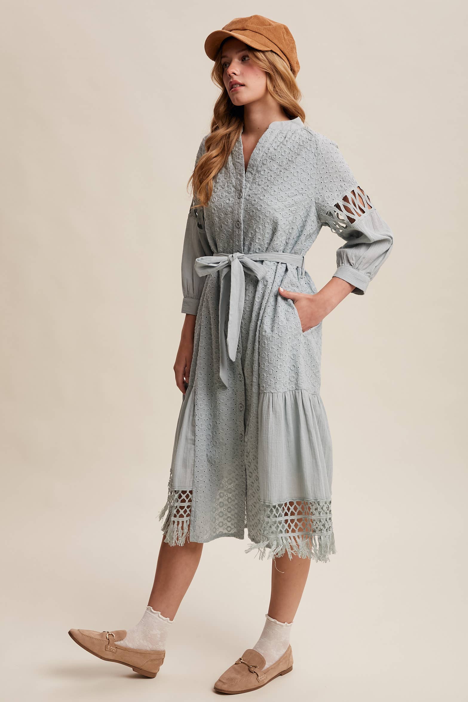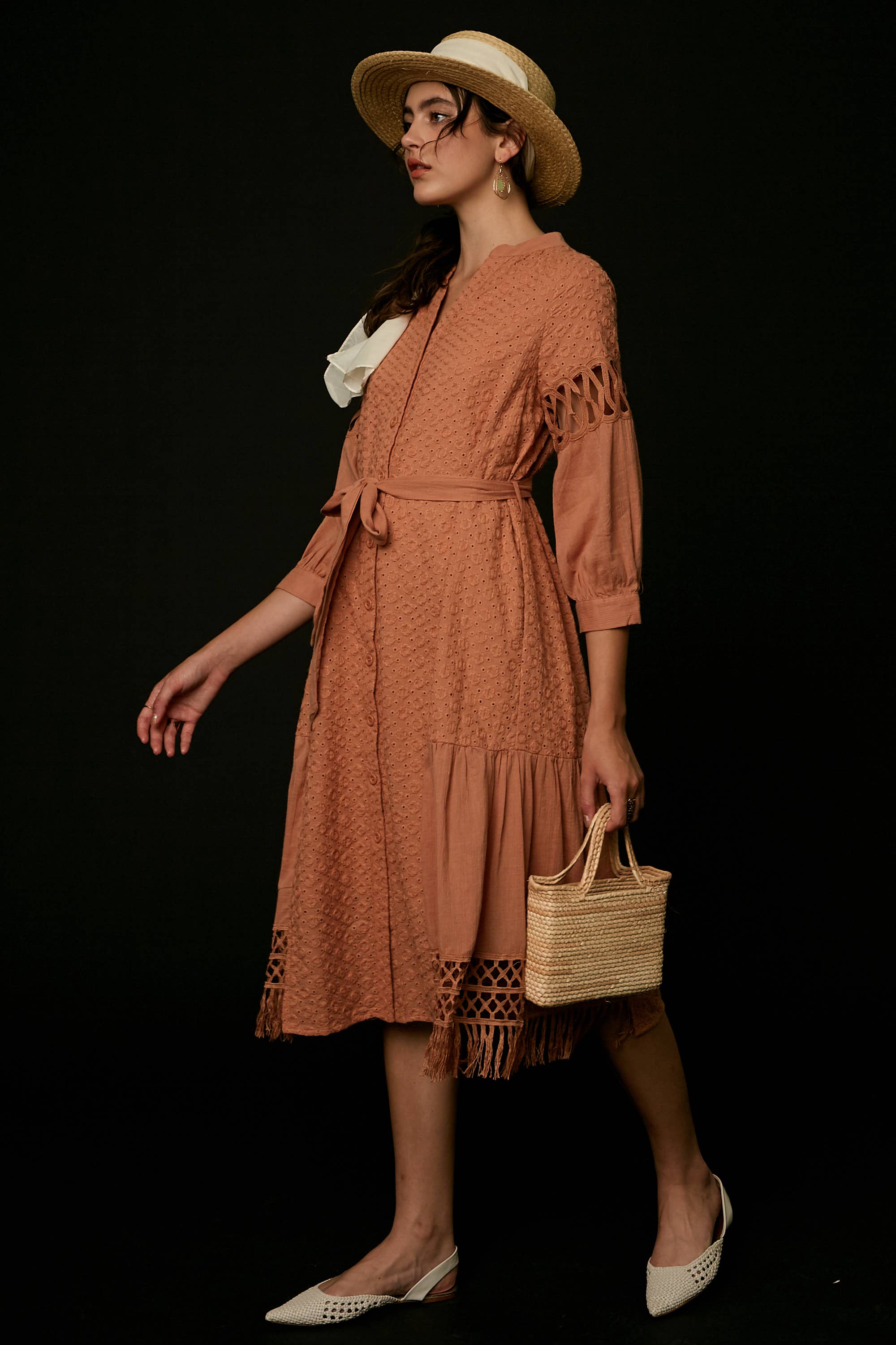 Discover effortless elegance with this charming midi dress, where delicate eyelet fabric meets striking lace-inspired cutouts. The open lattice sleeve details bring romantic appeal, while the button-front closure and adjustable self-fabric belt let you customize your look. Tiered panels provide graceful movement, and functional side pockets add practicality to the polished silhouette. Fully lined for comfort, this knee-grazing dress transitions seamlessly from casual outings to special occasions—a versatile wardrobe essential that balances refined sophistication with whimsical charm.