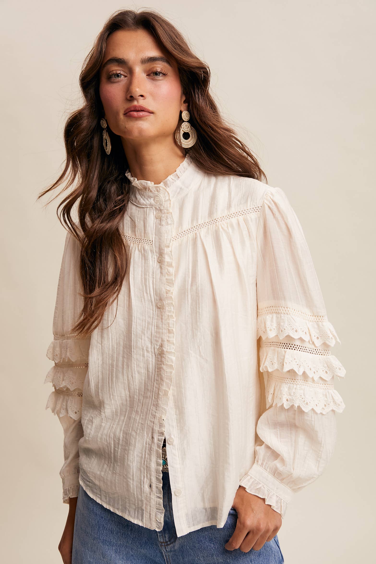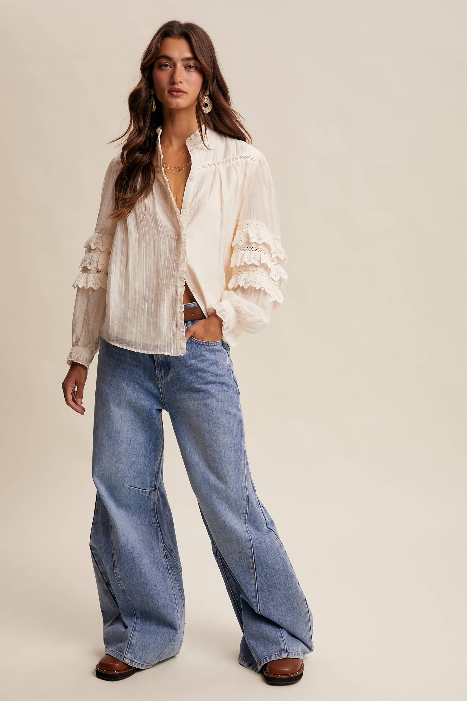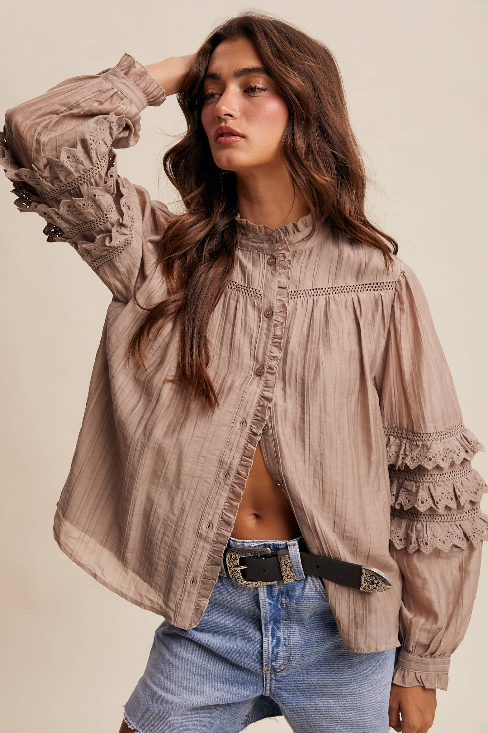Introducing the Listicle Lace Ruffle Sleeve Pintuck Blouse—where vintage charm meets modern playfulness! This dreamy piece features soft, textured fabric adorned with tonal pintucks, delicate ruffles framing the front, and gorgeous ladder lace inserts across the chest and sleeves. The showstopper? Triple rows of eyelet lace ruffles on the sleeves that add serious volume and whimsy. With a relaxed, gathered silhouette and lined body for comfort, this button-front beauty is endlessly versatile—tuck it, layer it, or wear it solo. Perfect for anyone craving that effortlessly romantic, slightly quirky aesthetic.