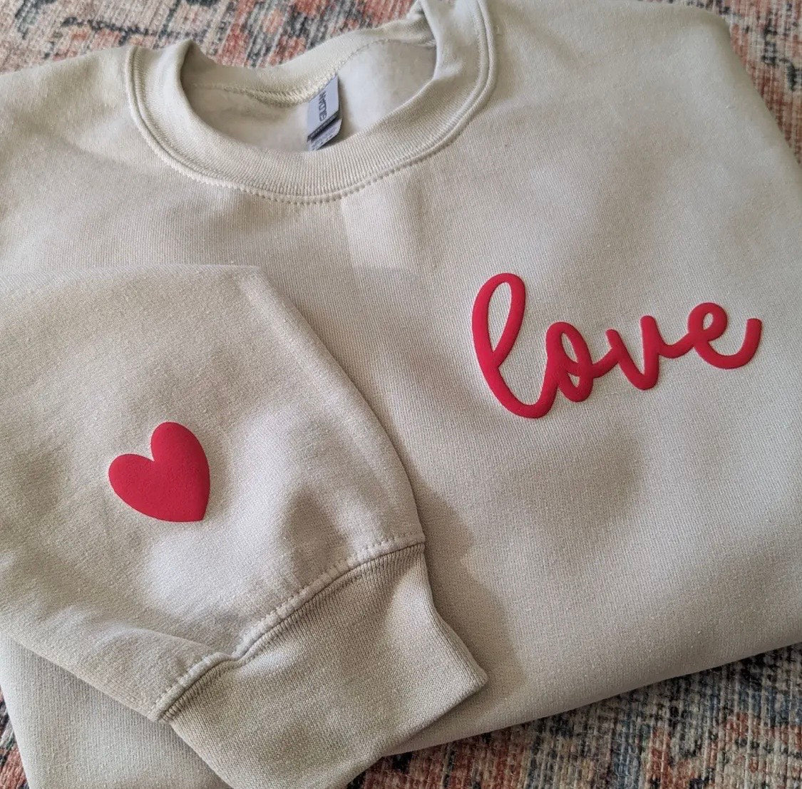 Spread the love in this cozy sweatshirt featuring a bold puff print design that pops. Perfect for casual days when you want to make a statement without saying a word. The soft, comfortable fit keeps you feeling great whether you're running errands or hanging with friends. A wardrobe essential that combines style with comfort—because looking good shouldn't feel like work.