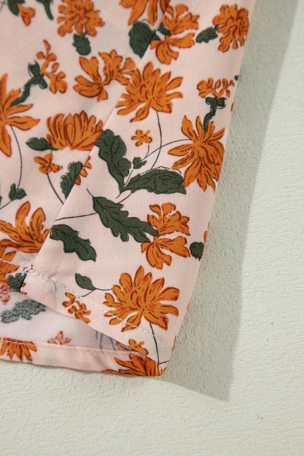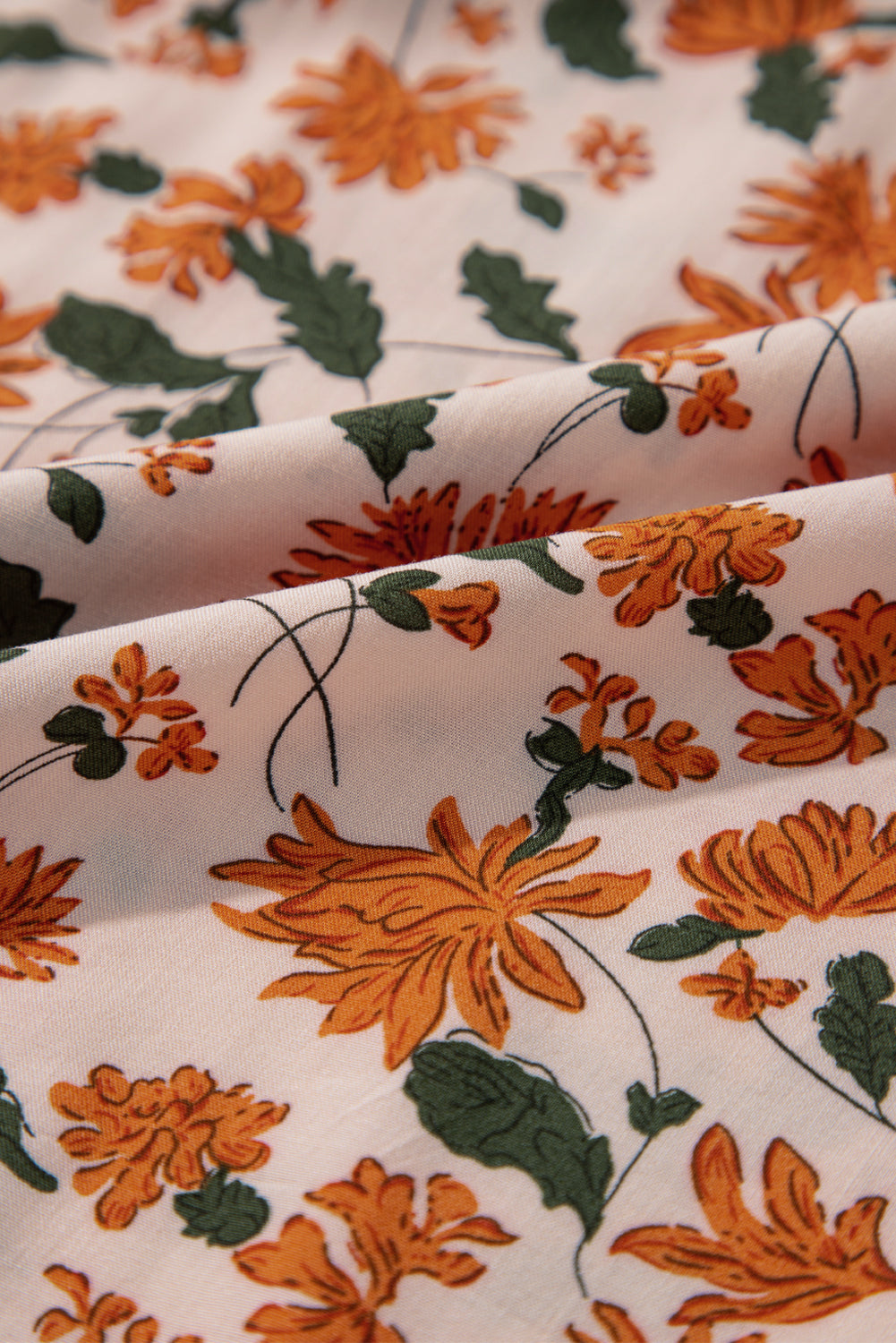 Beige Floral Deep V Neck Smocked Bust Bubble Sleeve Babydoll Dress