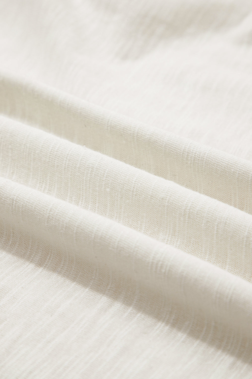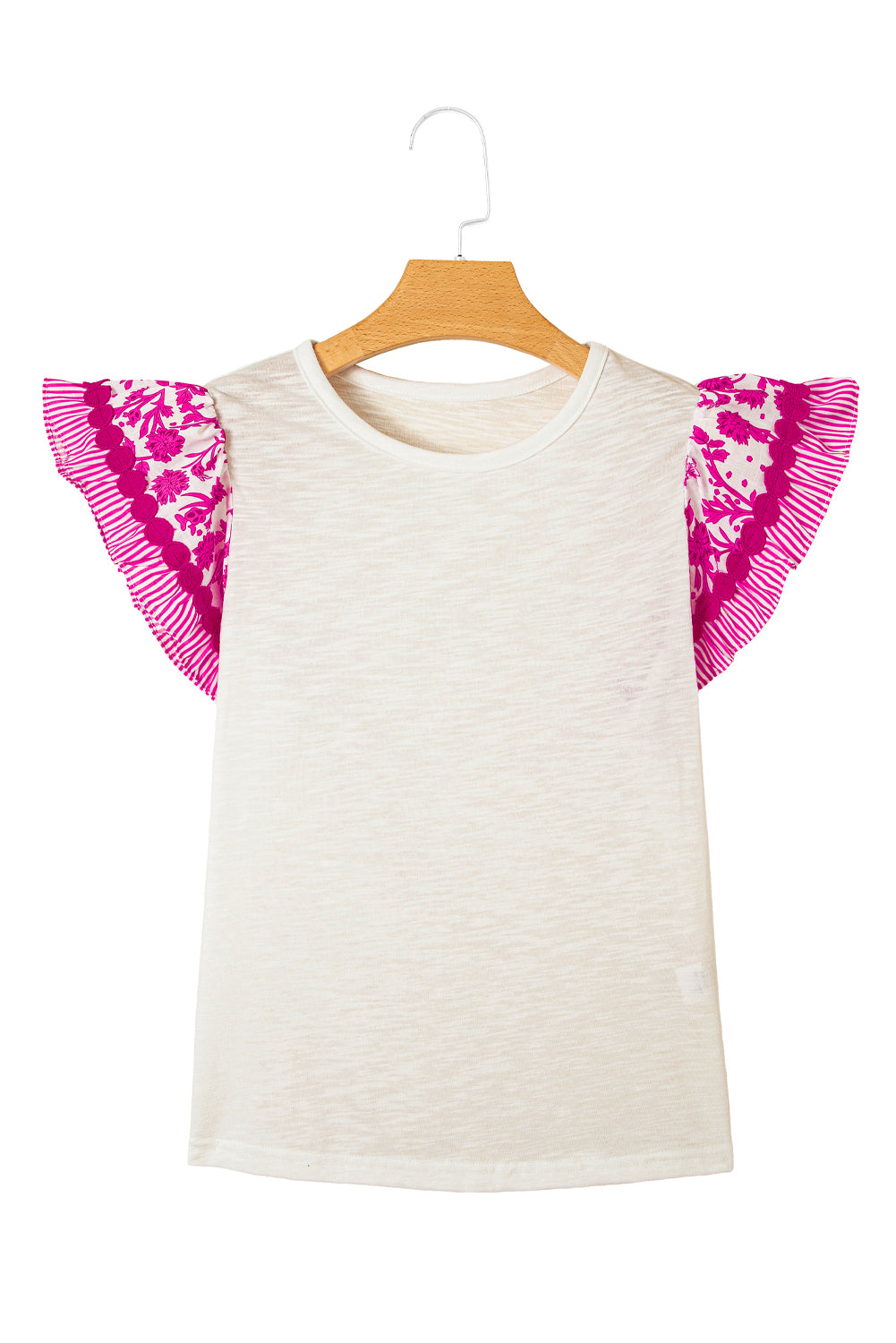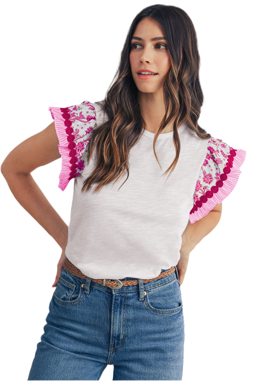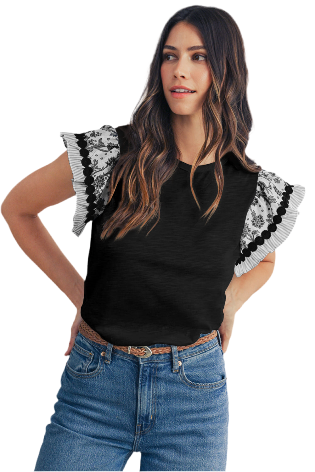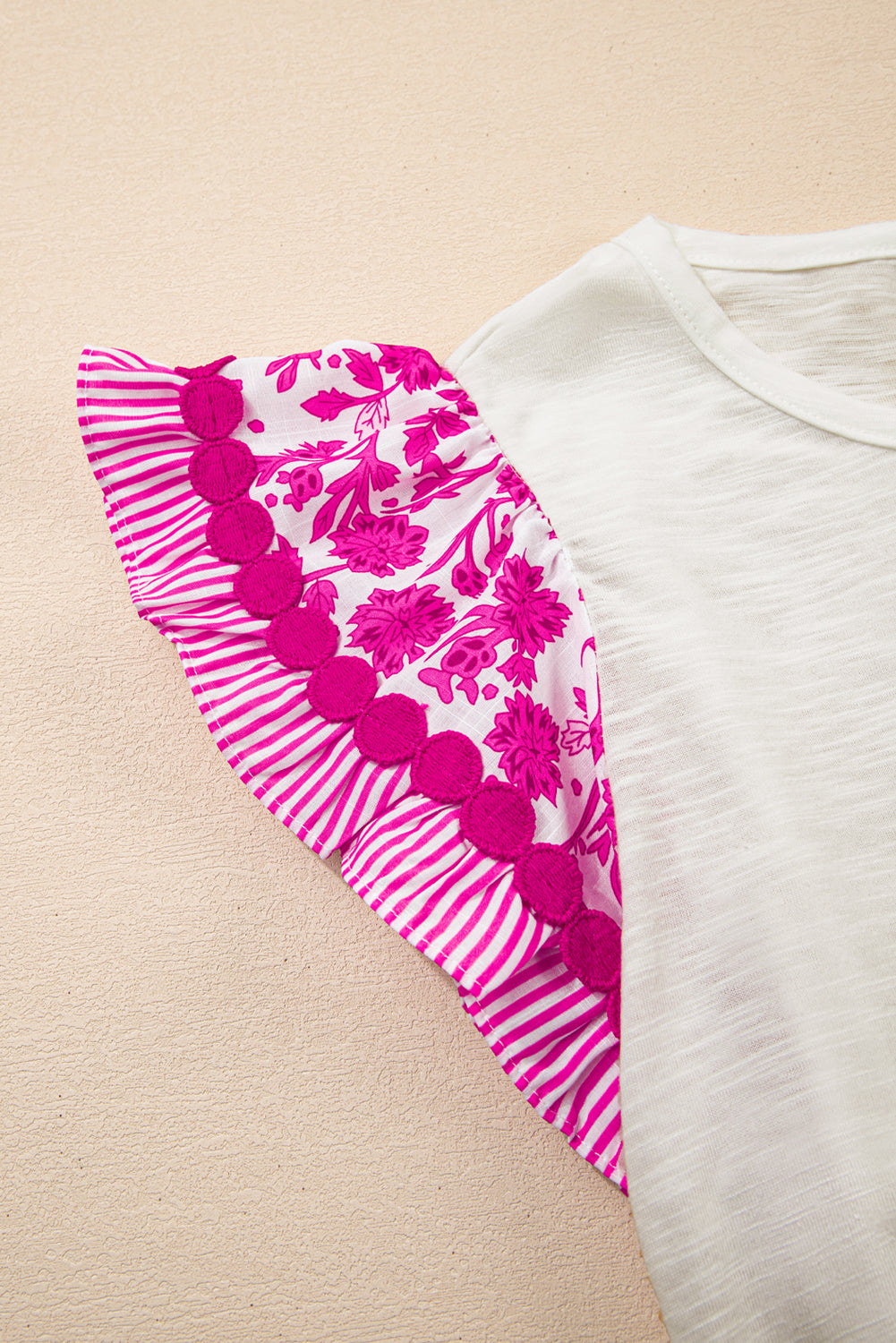 This exquisite blouse artfully combines floral and striped patterns, creating a sophisticated fusion of bohemian allure and timeless refinement. Delicate ruffle elements enhance its feminine appeal, establishing an enchanting silhouette suitable for diverse settings. Meticulously crafted from premium fabrics, it delivers both exceptional comfort and a flattering drape. The graceful flutter sleeves offer effortless elegance, while the distinctive patchwork composition elevates this versatile garment into a statement piece for the discerning wardrobe.