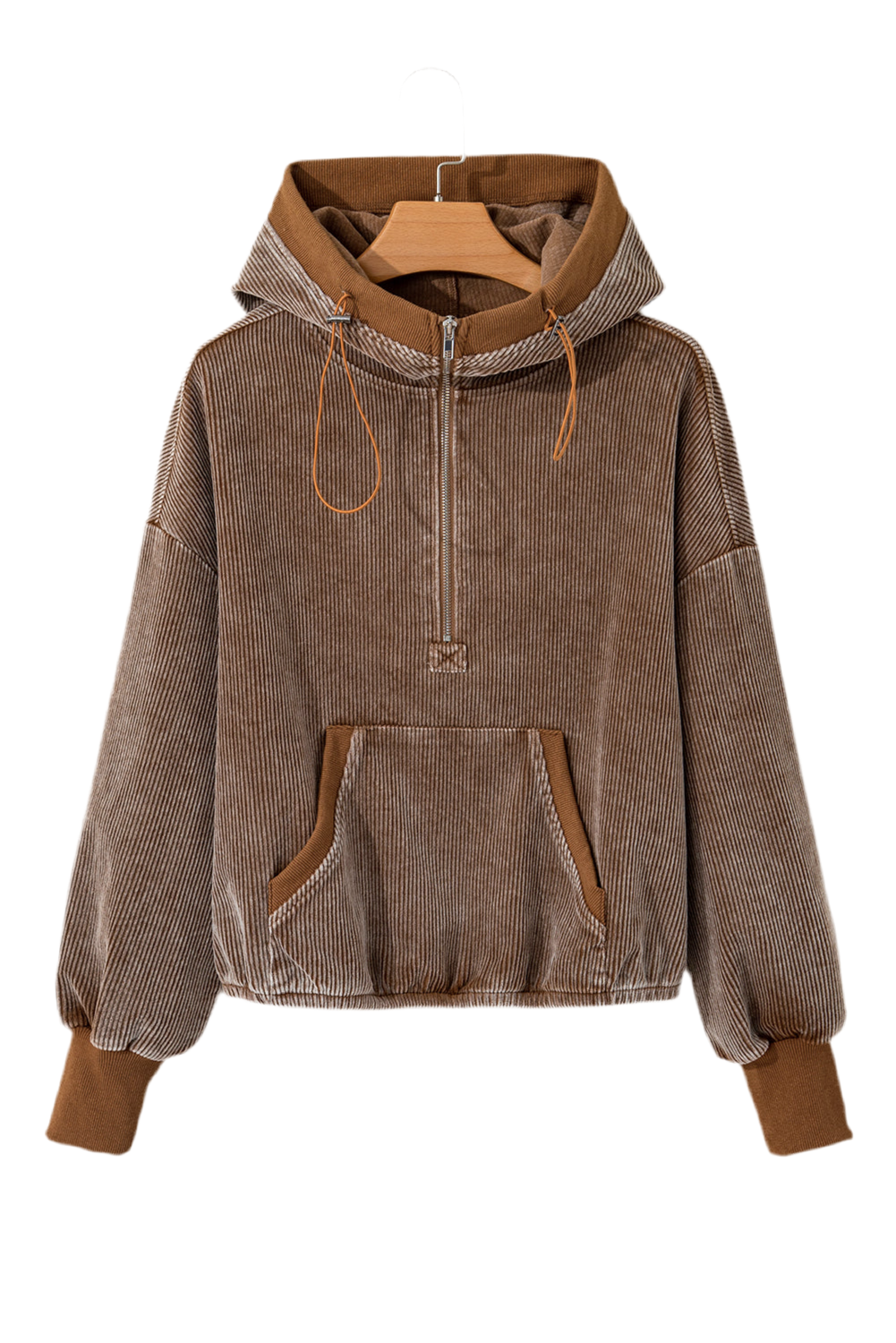 Chestnut Half Zipper Kangaroo Pocket Drawstring Corduroy Hoodie