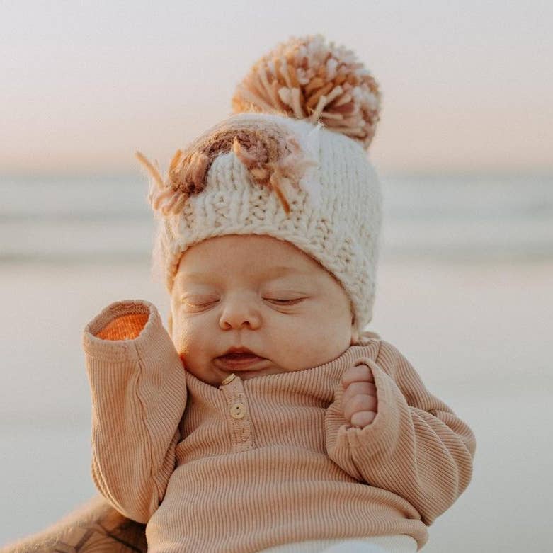 You'll love this beautiful beanie hat in cozy natural colored yarn, adorned with a rainbow in earthy hues of pink and brown. Topped with a pom pom, this looks great with everything.