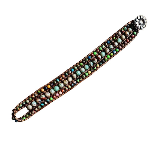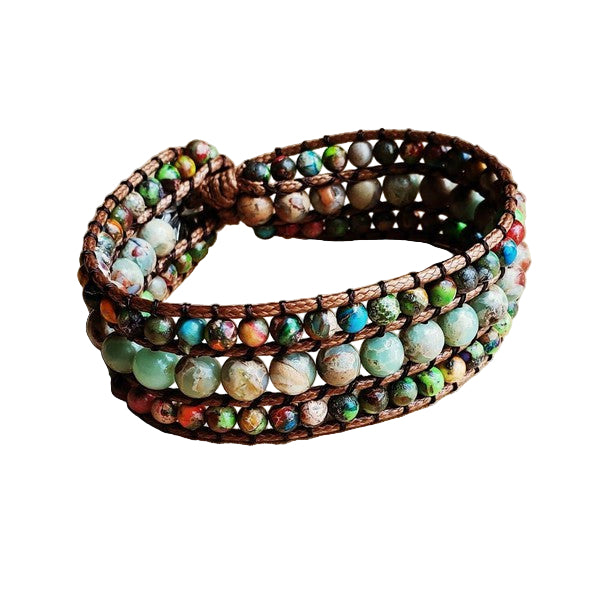 Elevate your style with our handcrafted Woven Regalite Stone Bracelet. Made with stunning Impression Jasper beads, this boho-inspired bracelet adds a touch of western flair to any outfit. Expertly woven for a unique and textured look, making it a must-have accessory.