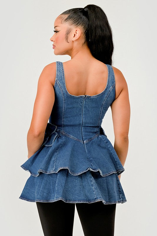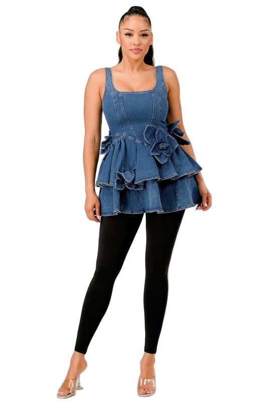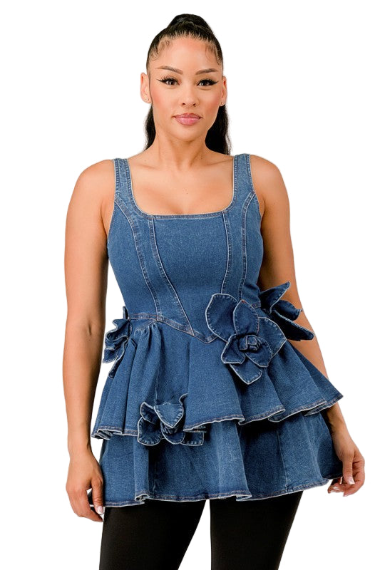 This denim peplum top is designed with a square neckline and fitted bodice for a flattering shape. The layered ruffle tiers create a playful silhouette while the side 3D floral appliques add a feminine touch. Made in a medium wash denim that is versatile and easy to style. Perfect to pair with leggings, jeans, or skirts for both casual and elevated looks.