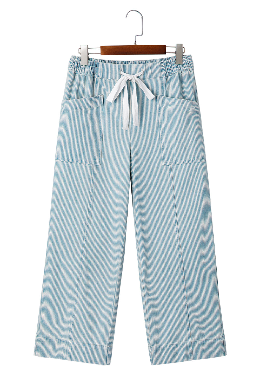 Sky Blue Striped Mid Rise Drawstring Waist Jeans