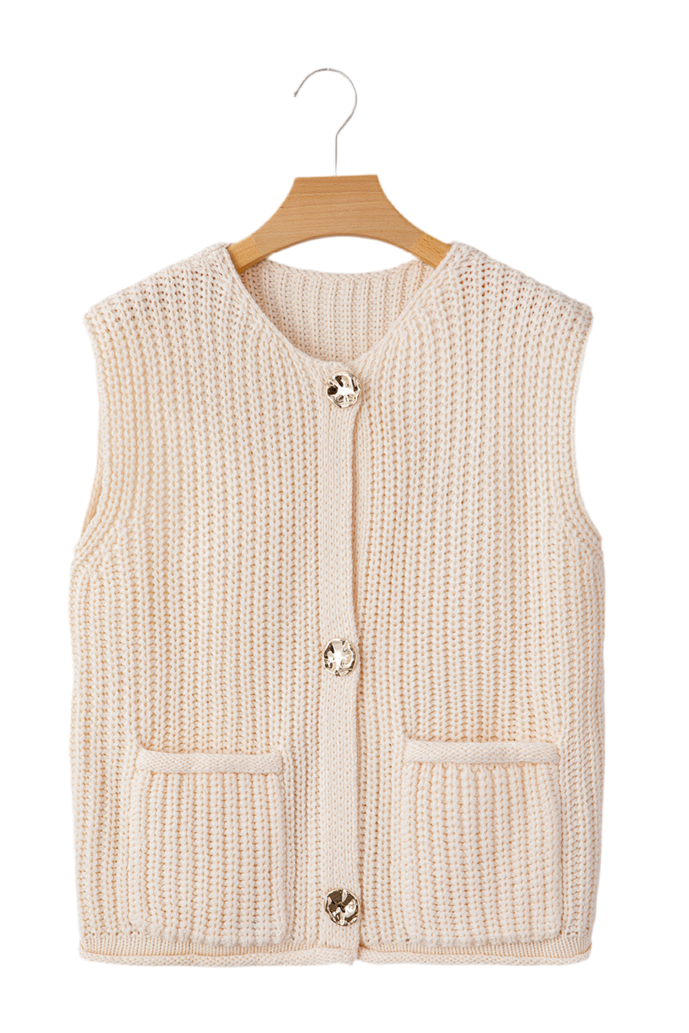 Texture meets timeless style with this white knitted vest—your new favorite layering piece! The solid color keeps things chic and effortless, while the buttoned front adds that polished, refined vibe. Love the sleeveless design? Us too—it's perfect for throwing over dresses, tees, or anything in your closet. Plus, those side pockets? They're the cherry on top. Whether you're dressing up or keeping it casual, this versatile vest is ready to elevate your look with minimal effort and maximum charm.